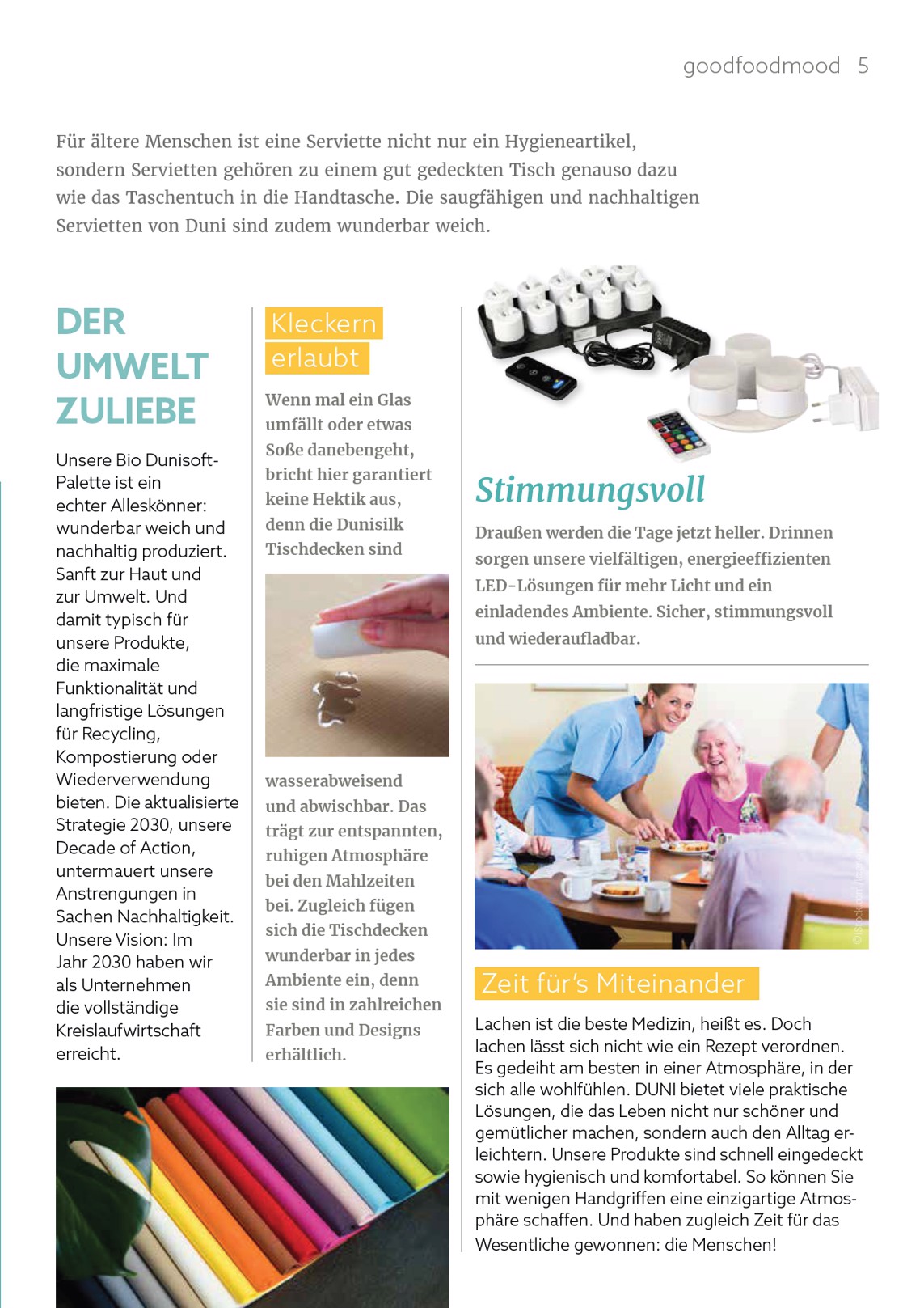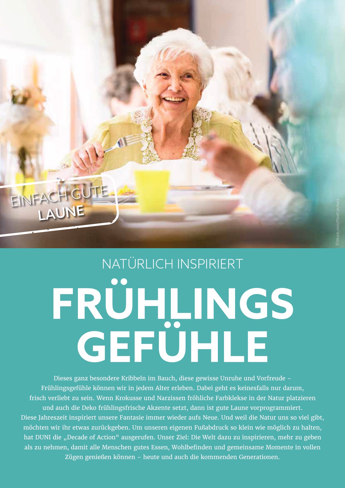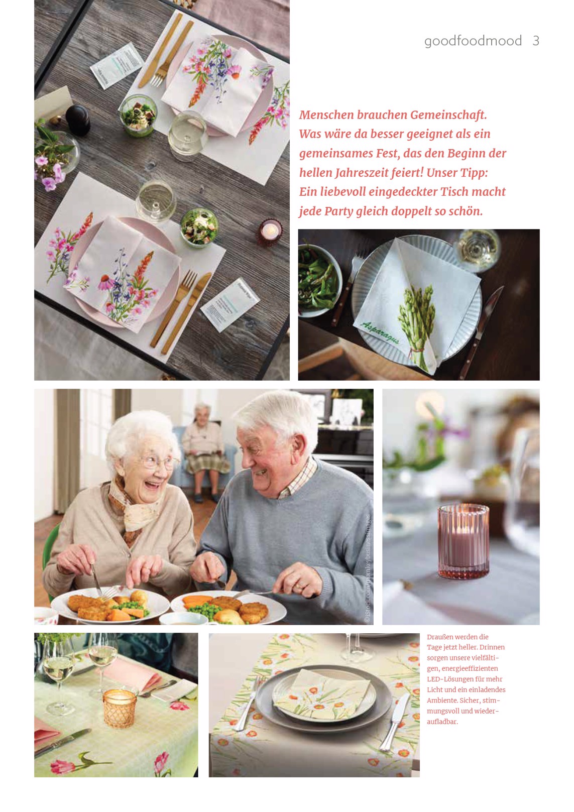 SENIOREN- UND PFLEGEHEIME KOLLEKTION FRÜHLING & SOMMER 2023 Tafelfreuden IDEEN FÜR DEN GEDECKTEN TISCH BLÜTENREICH Unser Frühlings-/Sommersortiment zaubert Atmosphäre auf den Tisch ERHELLEND LEDs - praktisch und energieeffizient MAHLZEIT Schöne Deko macht Appetit, denn das Auge isst bekanntlich mit